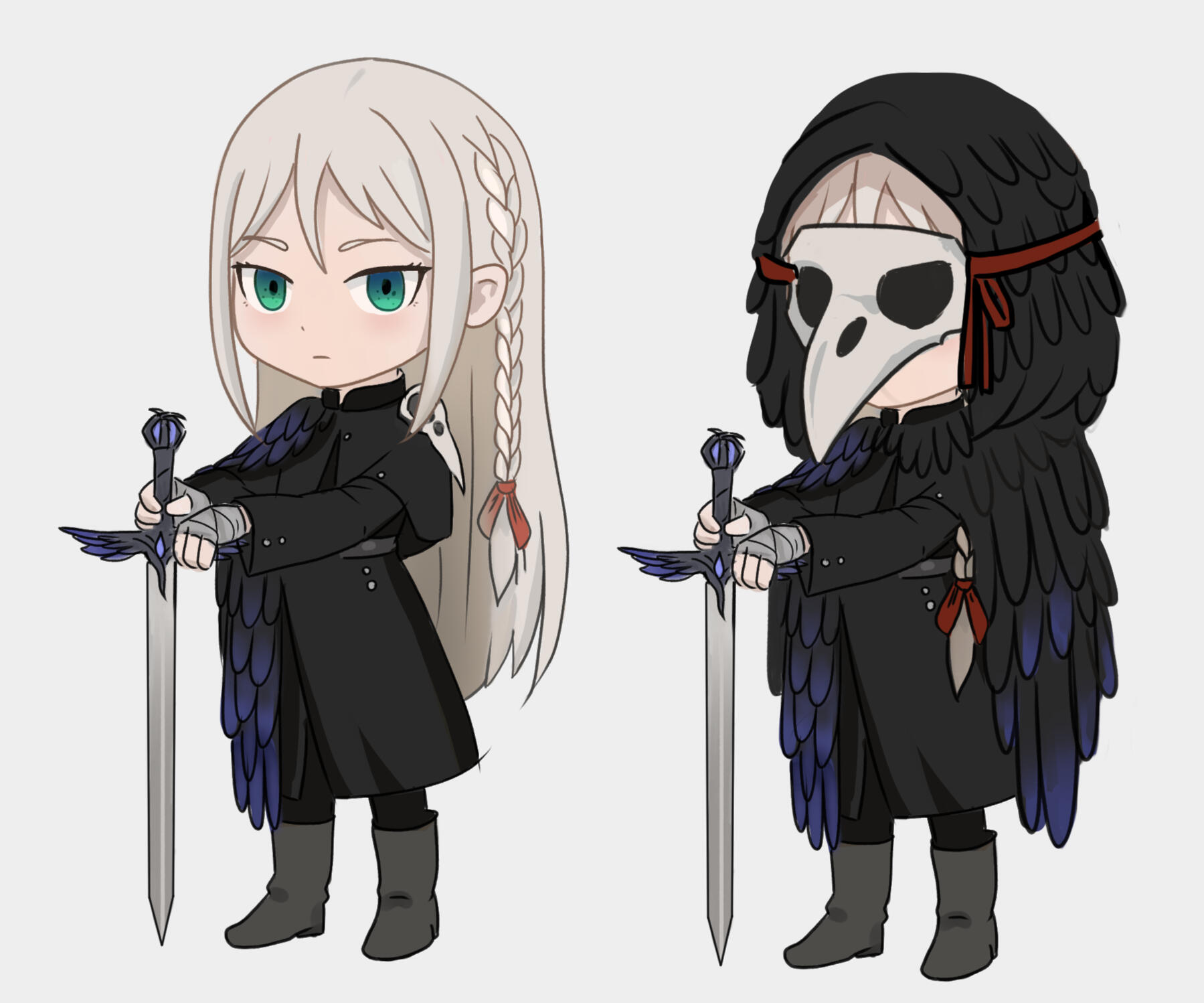 I'm open with any interpretation of my character as long as resemblance is there (same hair color, eye color - eyes have small dots - crow skull mask, and braid with red ribbon)